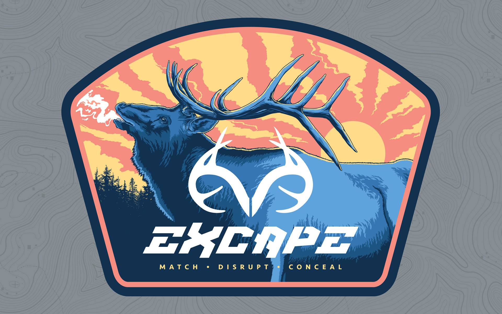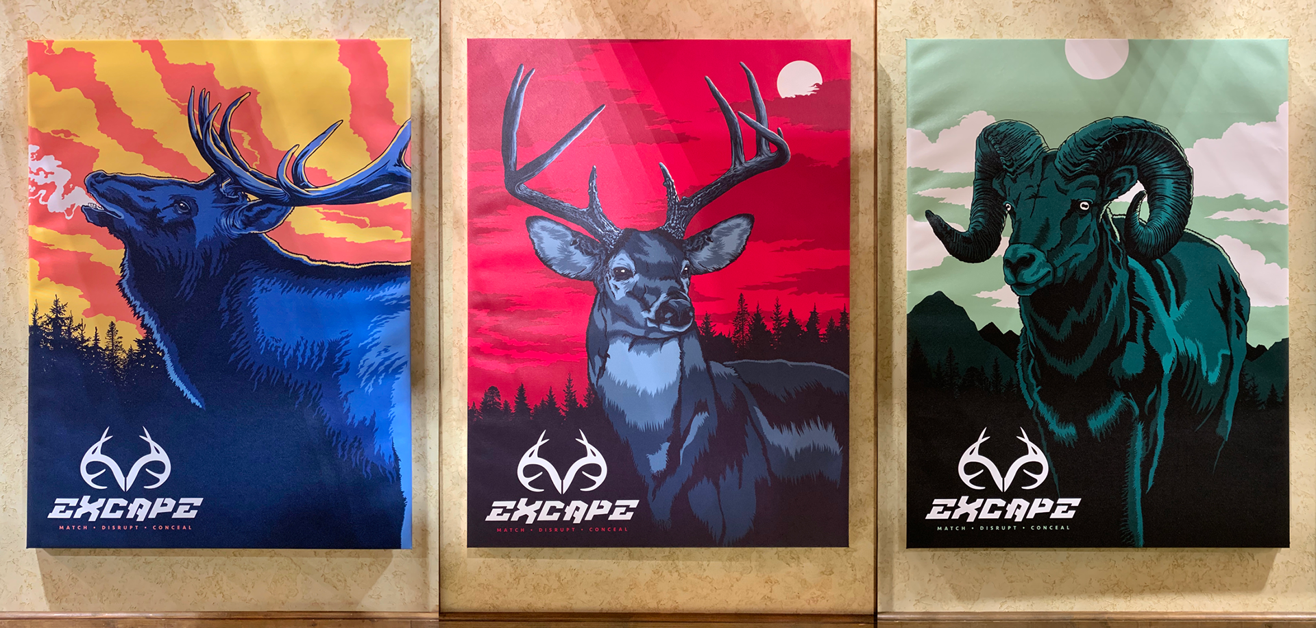In support of Realtree EXCAPE™, I created a series of three vector illustrations used as 30x40 Canvas Prints, stickers, and patches. These were displayed and handed out at the Realtree booth during the 2020 Shot Show in Las Vegas.
