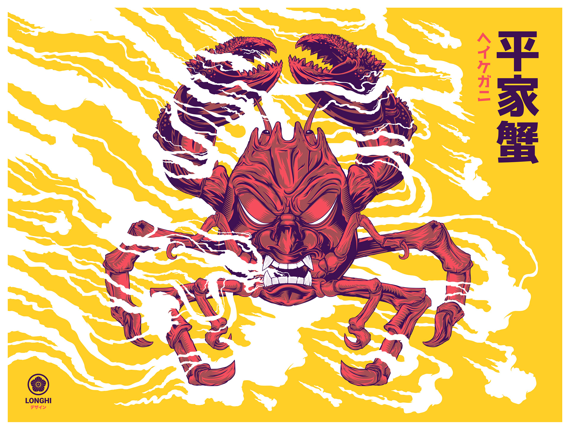 Heikegani 平家蟹 are a species of crab native to Japan's inland sea, with a carapace that bears a pattern resembling an angry samurai. According to Japanese folklore, it is believed the Heikegani are reincarnations of the defeated Heike warriors at the Battle of Dan-no-ura in 1185 AD as told in “The Tale of the Heike”.