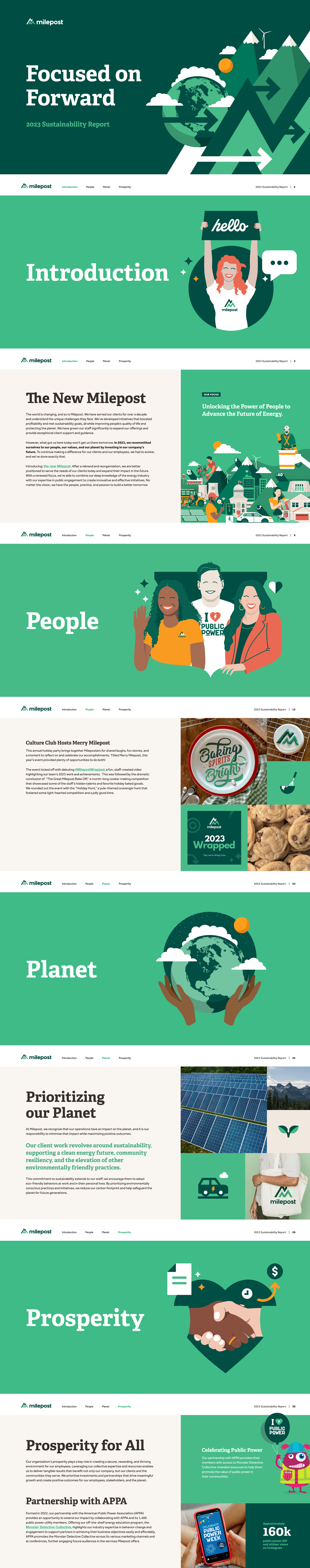 Created a distinctive vector illustration style as part of a comprehensive branding system for Milepost, a women-owned business that collaborates with organizations that share their deepest values — to do right by people and our planet by building an equitable, resilient, and lasting energy future. As a certified B Corp and a Social Purpose Corporation, they put their hearts into their work, partnering with clients to anticipate and solve today’s most pressing energy challenges and drive meaningful and measurable change for them and society.