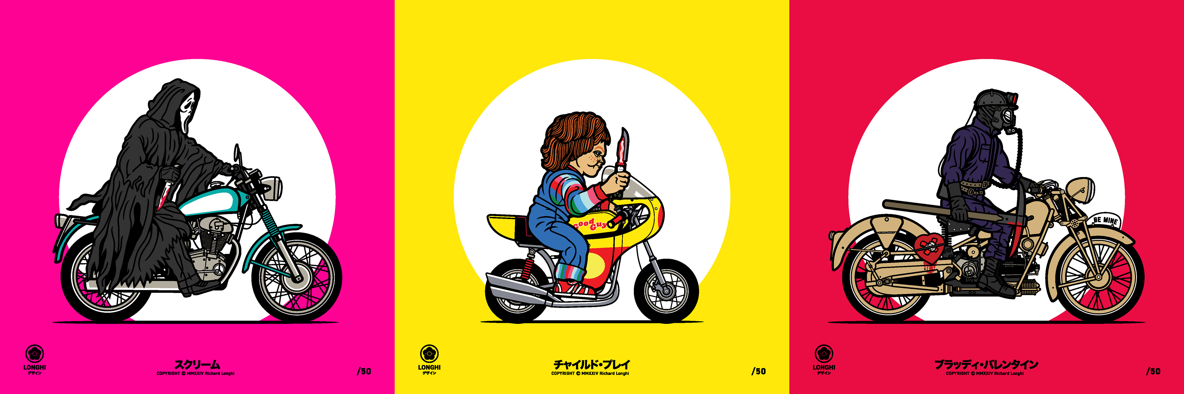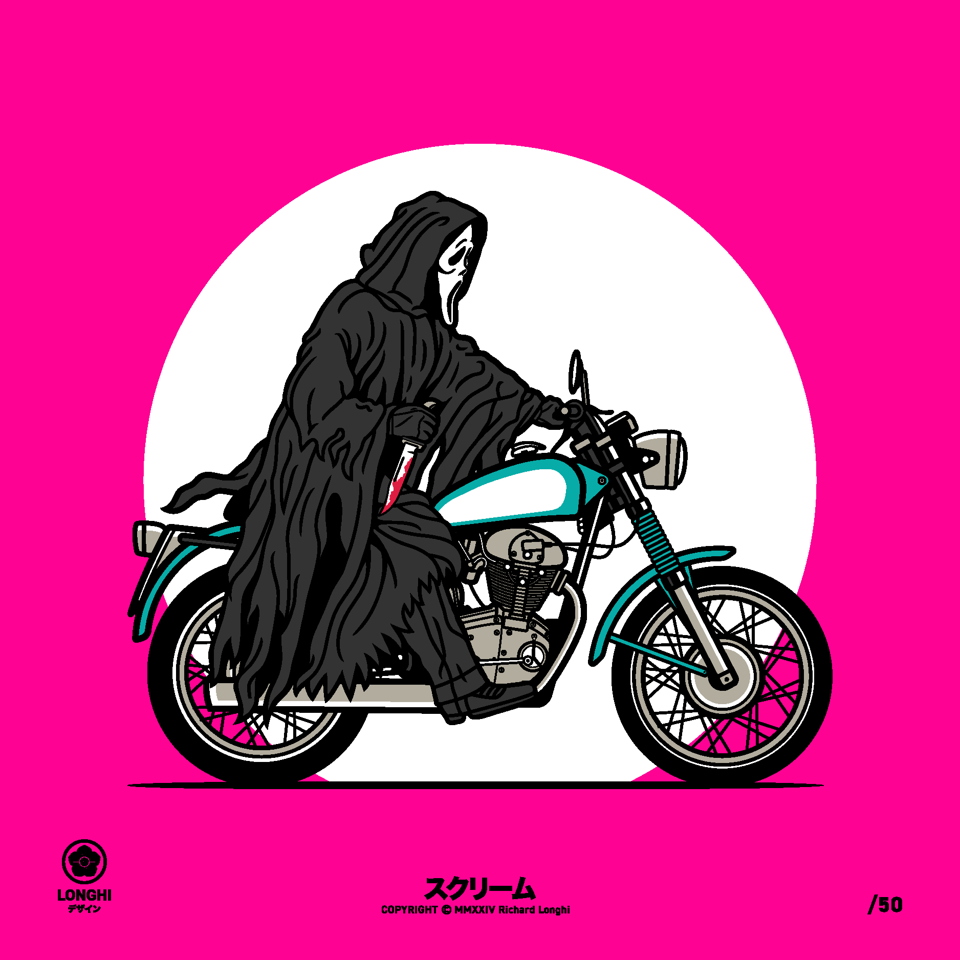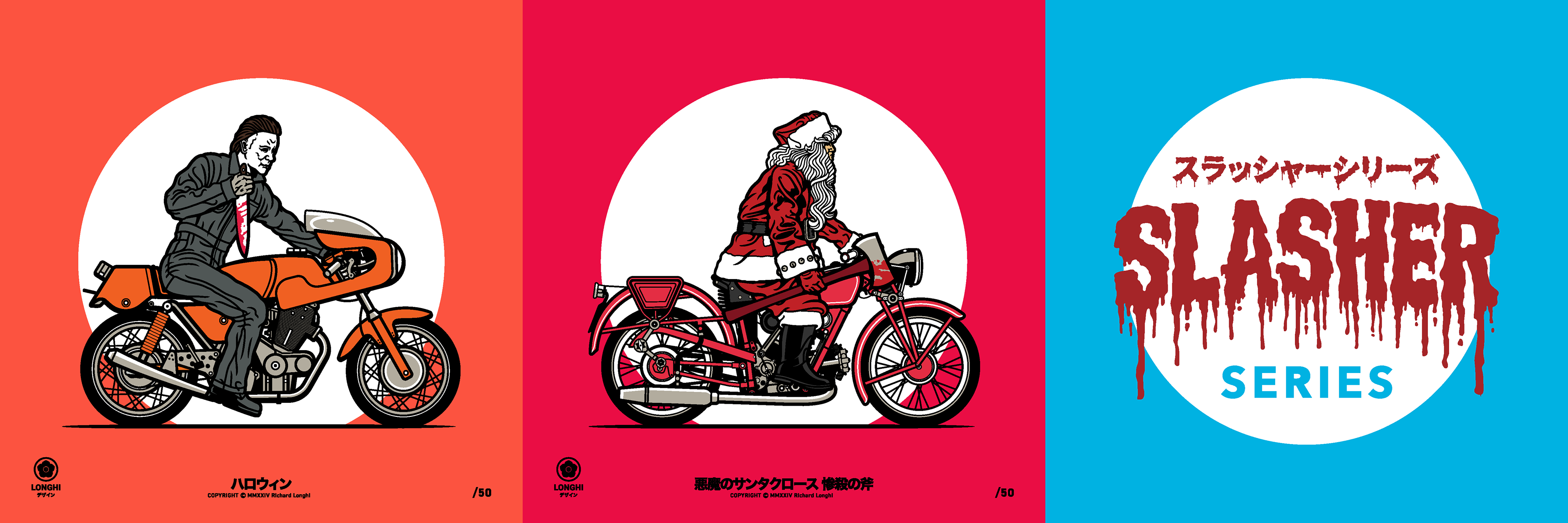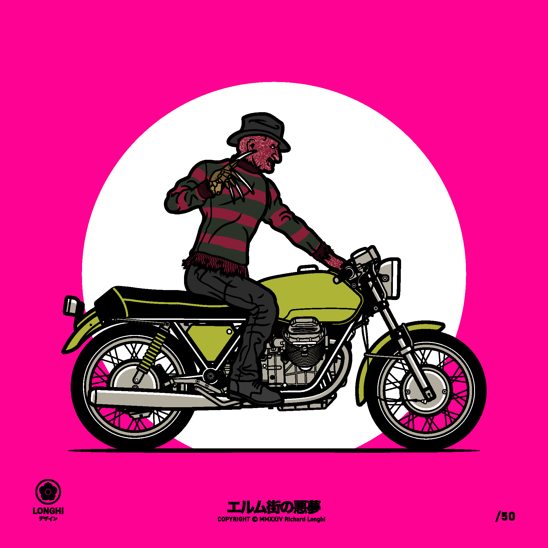 An Illustration series I created that combines vintage Italian motorbikes and some of my favorite slashers from the 80's. I have made t-shirts and stickers, and I hope to create posters soon.